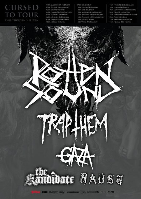 Das Blödeste, was ich nach einem ROTTEN SOUND-Konzert sagen kann ist: Mensch, sie haben zwei meiner Lieblingssongs nicht gespielt. Was daran so blöd ist? Naja, bei dem Soundbrei, der heute Abend fabriziert wird, klingt eh eine Nummer wie die andere. ROTTEN SOUND haben aber dennoch wieder alles dabei, was sie dabei haben müssen: Messerscharfe, abartig derbe Riffs, pfeilschnelles Schlagzeug, das nicht nur im Blast Beat-Bereich, sondern auch in Uptempo-Mosh-Parts zu Hause ist, einen krass verzerrten Bass und den sympathischsten aller Gesangsgrantler am Mikrofon. Keji Niinimaa führt ROTTEN SOUND gewohnt bodenständig an, zeigt aber mit seinem wilden Geschrei, dass er auch anders kann. Vierzig Minuten lang geht es quer durch die letzten Alben von ROTTEN SOUND, der Fokus liegt natürlich auf dem neuen Werk Cursed und dem Werk von 2008, Cycles, auch wenn das nicht immer rauszuhören ist – der Sound ist wie bereits mehrfach erwähnt katastrophal, vor allem bei dieser Form von Musik. Scheinbar sammeln die meisten Münchner im Laufe des Abends nur Kräfte, denn zum ersten Mal geht vor der Bühne ordentlich was, auch wenn es nur gut fünfzehn Leute sind, die hier für Randale sorgen. (Captain Chaos)