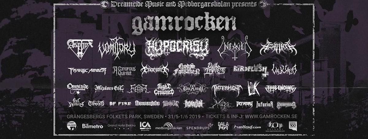 Schweden als Reisedestination für Auslandkonzerte lässt sich gemeinhin mit drei Locations zusammenfassen: Stockholm (weil der beste Death Metal von dort kommt), Göteborg (weil sie AT THE GATES haben) und SWEDEN ROCK FESTIVAL (im Süden, teuer, aber sonnig). Grängesberg in Dalarna ist definitiv nicht Teil dieser Trifecta, da hilft es auch nicht, dass das beliebte LOKA-Mineralwasser 2km vom GAMROCKEN-Festivalaustragungsort „Folkets Park“ abgefüllt wird und das Städtchen Ludvika der Heimatort HYPOCRISYs ist. Google Maps – wie immer optimistisch – gibt die Fahrzeit von Stockholm aus mit drei Stunden an, es sollte also machbar sein, einfach mal nordwestlich in den Elchwald rauszufahren. Natürlich ignoriert Google Maps das Faktum, dass die Strassen nach Uppsala einspurige 90 km/h-Strecken sind, wo Wohnmobile statt Elche die häufigsten Geschwindigkeitshemmer sind. Fahrdauer somit fast vier Stunden inklusive Umweg über einen Hügel mit vereinzelten sterbenden Bäumen – ein Csernobyl-Re-Enactment-Ort? Ein schwedischer Nukleartest? Der Ort, an dem die „The Final Chapter“-HYPOCRISY-Aliens gelandet sind vor 20 Jahren? Es bleibt ein Rätsel.