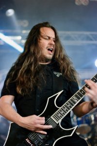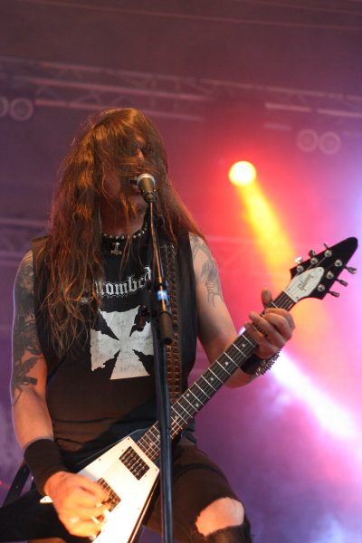 VOMITORY spielen am GAMROCKEN FESTIVAL ihren einzigen Festivalgig in Schweden und sind für einmal nicht allzu weit von zuhause entfernt. Die zugige Hauptbühne ist an diesem Abend nicht gerade gemütlich, doch ist es noch immer hell und die Stromversorgung reicht auf alle Fälle für VOMITORY an diesem Abend. Einen ungewöhnlichen Patzer leisten sich die routinierten Värmländer zu Beginn – während des heroisch-klassischen Intros rutscht Gitarrist und Bandgründungsmitglied Urban auf der Bühne aus und fällt – inklusive Gitarre – auf den Bühnenboden. Die Schrecksekunde ist indes gleich vorbei, der Hüne grinst und VOMITORY stürzen sich gleich voller Elan in „The Voyage“ und „Gore Apocalypse“.