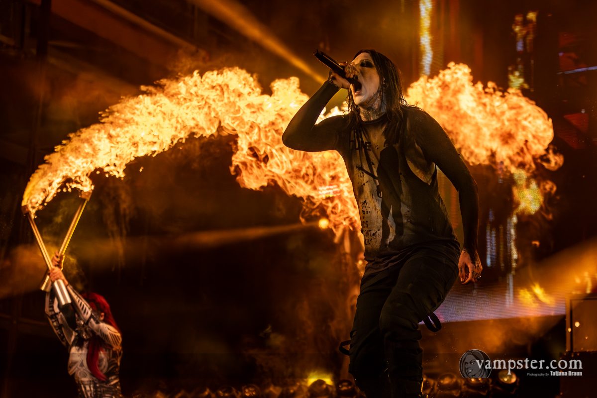 Die Flammenwerfer schießen mit dem Breakdown mehrere Meter in die Luft, während vier Tänzerinnen mittels präparierter Fackeln lodernde Kreise in die Luft zeichnen. Auf die Choreografien des Quartetts greift der Headliner im Laufe der Show gleich mehrfach zurück: Mit Wolfsmasken und roter Lederjacke im „Thriller“-Look stellt man in „Werewolf“ dessen Musikvideo nach, nachdem in „Thoughts & Prayers“ erst mit brennenden Gebetsbüchern hantiert wurde, nur um die vorderen Reihen dann mittels Wasserpistolen einer spontanen Taufe zu unterziehen.