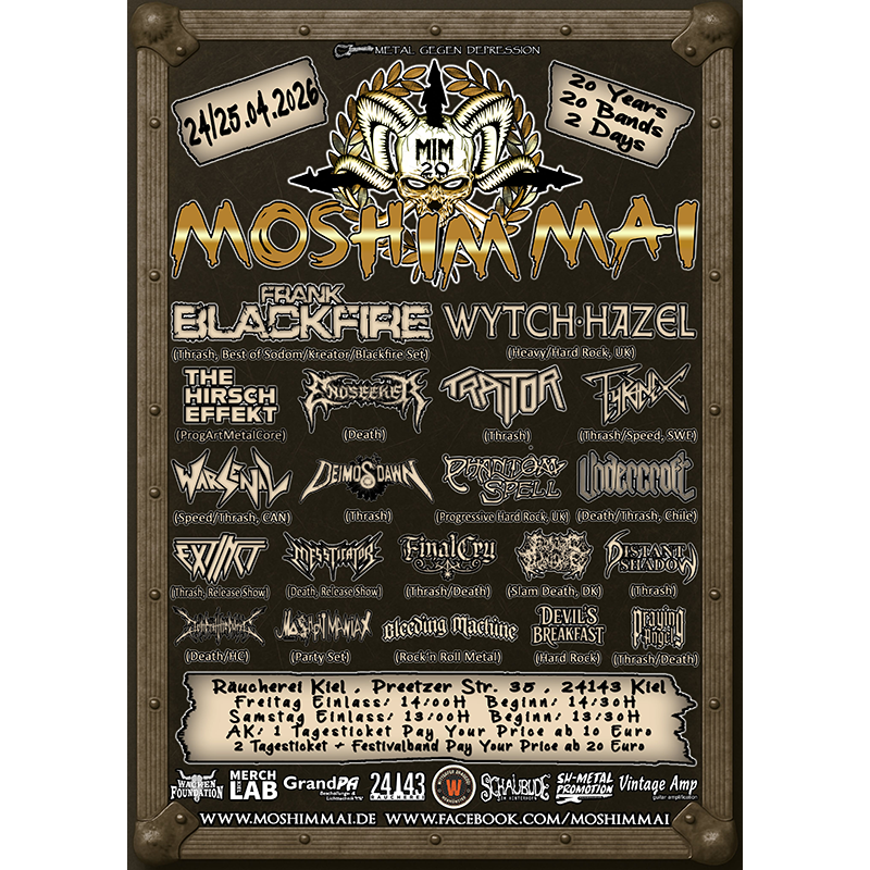 Seit 2005 findet das MOSH IM MAI FESTIVAL statt, in diesem Jahr feiert das Non-Profit-Festivals am 24. und 25. April 2026 in der Kieler Räucherei 20stes Jubiläum!