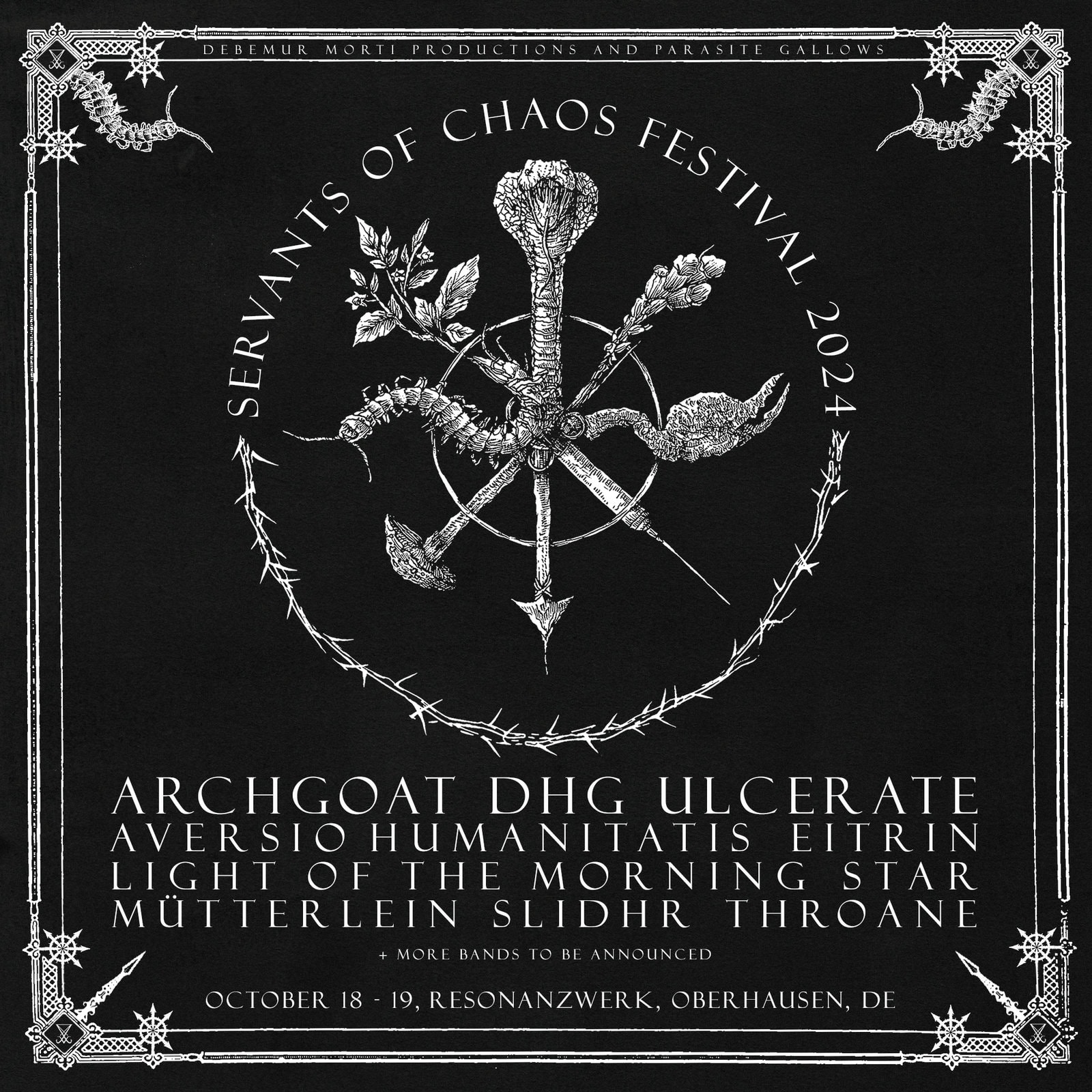 Unter dem Namen SERVANTS OF CHAOS feiern DEBEMUR MORTI PRODUCTIONS ihr 20. Jubiläum am 18. und 19. Oktober 2024 im Resonanzwerk Oberhausen.